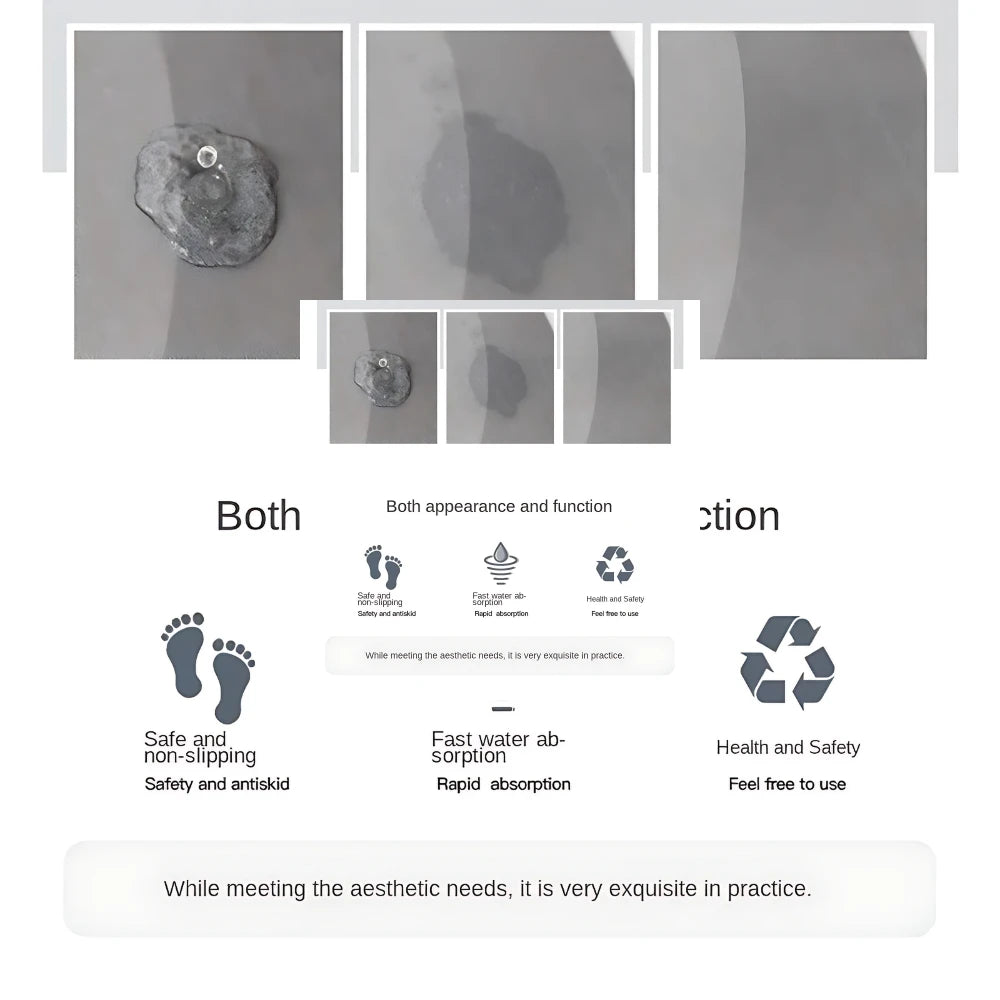 Rápida absorção : Nossos tapetes são feitos com material diatomáceo superabsorvente, desenvolvidos para absorver rapidamente a umidade, deixando o ambiente mais seco e evitando escorregões.